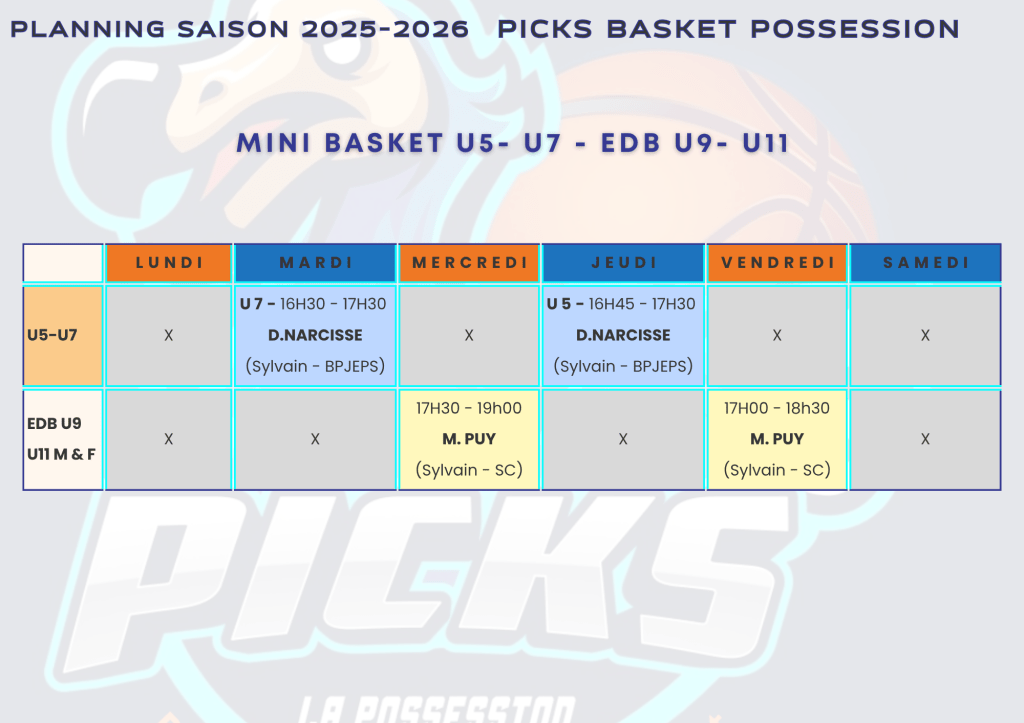 Encadrés par Coach Sylvain et l’équipe pédagogique du club, ces entraînements visent à développer le plaisir du jeu, la coordination et la confiance, tout en transmettant les valeurs fortes du Basket Picks : respect, partage et passion.
